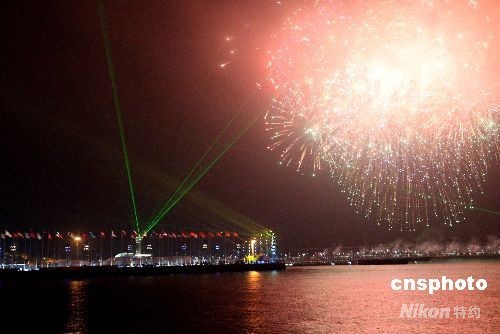 第29屆奧林匹運動會帆船比賽啟動儀式8月9日晚在青島舉行,絢麗多彩的煙花映亮奧帆中心。中新社發(fā) 趙振清 攝