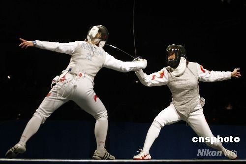 8月11日,北京奧運會女子花劍個人1/16決賽在北京國際會議中心擊劍館舉行,中國選手張蕾(右)以15:8的成績戰(zhàn)勝波蘭選手瑪烏戈熱塔·沃伊科夫亞克,成功晉級。圖為張蕾在比賽中。 中新社發(fā) 盛佳鵬 攝