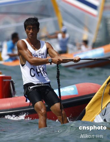 8月11日下午,奧帆賽尼爾級帆板開賽,在剛剛結(jié)束的男子帆板第二輪比賽中。中國選手王愛忱小組排名第八,前兩輪比賽總排名第三,凈得分10。 中新社發(fā) 周青先 攝