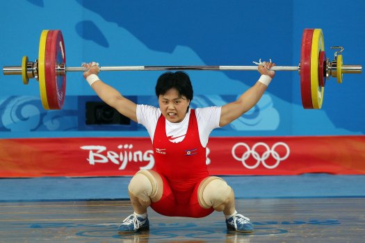 8月12日,朝鮮選手樸賢淑在北京奧運會女子舉重63公斤級比賽中。