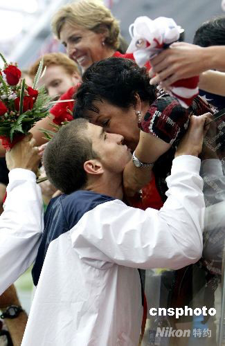 8月13日,美國游泳傳奇人物菲爾普斯,在北京奧運(yùn)會(huì)男子4乘200米自由泳接力中奪得自己奧運(yùn)會(huì)的第11枚金牌后,擁抱并親吻在“水立方”看臺(tái)上觀戰(zhàn)的媽媽黛比(Debbie)。 中新社發(fā) 杜洋 攝