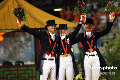 八月十四日晚,在香港沙田奧運(yùn)馬術(shù)主賽場(chǎng)上,丹麥隊(duì)獲得奧運(yùn)馬術(shù)盛裝舞步團(tuán)體賽銅牌。中新社發(fā) 洪少葵 攝