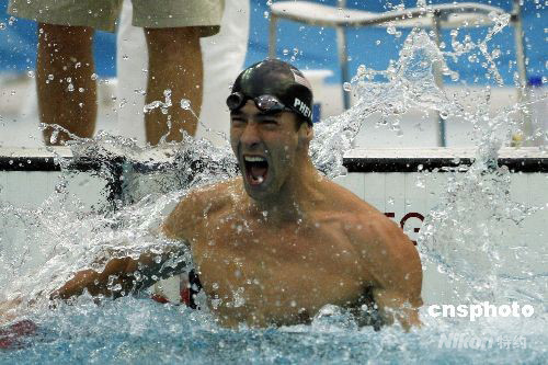 8月16日上午,菲爾普斯在北京奧運(yùn)男子100米蛙泳項(xiàng)目中以50秒58秒的成績(jī)奪得他在本屆奧運(yùn)會(huì)上的第七塊金牌。獲得銀牌的捷克選手只比菲爾普斯慢了0.01秒。 此前菲爾普斯已經(jīng)得到了男子400米個(gè)人混合泳、男子4×100米自由泳接力、男子200米自由泳、男子200米蝶泳、男子4×200米自由泳接力和男子200米個(gè)人混合泳六塊金牌。 中新社發(fā) 杜洋 攝