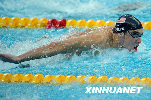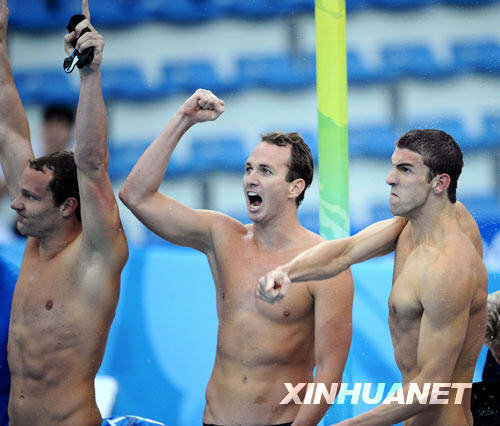 8月17日,菲爾普斯領銜的美國隊以3分29秒34的成績打破世界紀錄并奪得金牌。這是菲爾普斯繼男子400米個人混合泳、男子4x100米自由泳接力、男子200米自由泳、男子200米蝶泳、男子4x200米自由泳接力、男子200米個人混合泳和男子100米蝶泳之后,收獲的第八枚北京奧運會金牌,打破前輩施皮茨在1972年慕尼黑奧運會上創(chuàng)造的一屆拿七塊金牌的紀錄。 新華社記者 陳凱攝