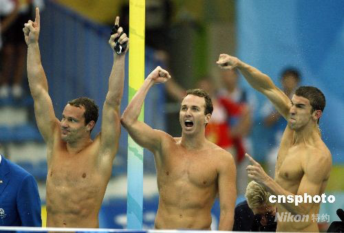 8月17日,美國(guó)隊(duì)獲得北京奧運(yùn)會(huì)男子4乘100米混合泳接力冠軍,至此,23歲的美國(guó)游泳運(yùn)動(dòng)員菲爾普斯不僅用8金刷新了單屆奧運(yùn)會(huì)金牌紀(jì)錄,而且還將個(gè)人所有奧運(yùn)會(huì)的金牌總數(shù)提高到了14枚,達(dá)成了他人難以超越的“世界紀(jì)錄”。 中新社發(fā) 杜洋 攝