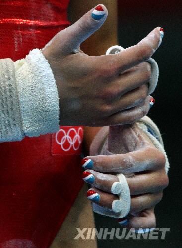 用法國國旗的顏色裝飾指甲的法國選手拉埃蒂婭·迪甘準(zhǔn)備進(jìn)行高低杠比賽。 新華社記者蘭紅光攝