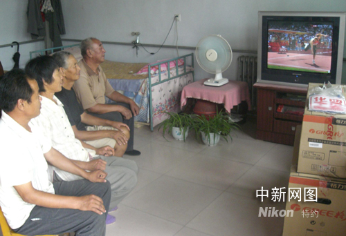 宋愛民鄉(xiāng)鄰正在她家觀看奧運(yùn)比賽(中間2人是她的父母)。崔志平 攝