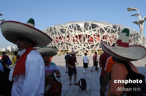 北京奧運(yùn)接近尾聲,北京奧林匹克公園仍然人流不減。圖為戴著大草帽的墨西哥觀眾游覽公園。 中新社發(fā) 廖攀 攝