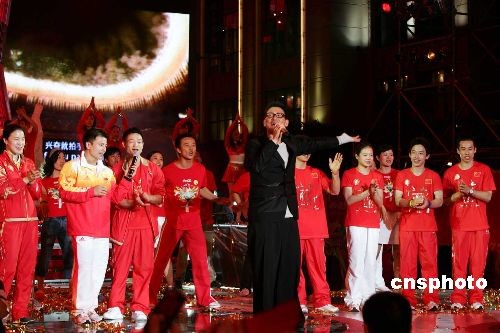 8月23日,在北京奧運(yùn)會即將閉幕之際,香港演藝巨星張學(xué)友攜手中國奧運(yùn)冠軍王楠、張湘祥、楊威、陳一冰、程菲、鄒凱、肖欽,一同亮相北京奧運(yùn)文化廣場,與民眾分享這場體壇盛宴,為中國加油,為奧運(yùn)加油。中新社發(fā) 富田 攝