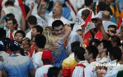 8月24日晚,北京奧運(yùn)會(huì)閉幕式上,姚明友好的擁抱一位金發(fā)美女。中新社發(fā) 武仲林 攝