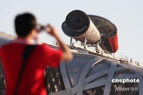 2008年8月31日,工作人員在“鳥巢”上方檢修火炬塔。9月6日,北京殘奧會(huì)主火炬將在國家體育場(chǎng)“鳥巢”再一次被點(diǎn)燃。 中新社發(fā) 吳芒子 攝