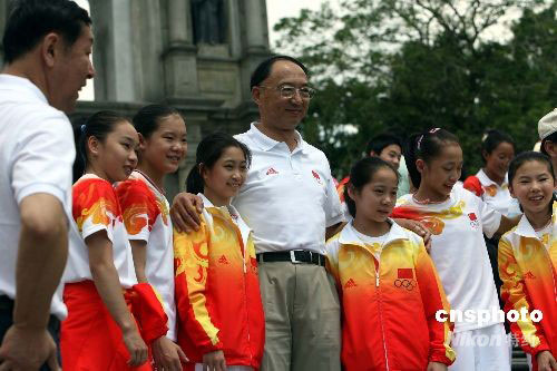 九月一日上午,北京奧運(yùn)內(nèi)地金牌運(yùn)動(dòng)員代表團(tuán)在澳門展開第二日訪問行程,代表團(tuán)團(tuán)長劉鵬與奧運(yùn)女子體操團(tuán)體金牌選手們在澳門著名景點(diǎn)大三巴前留影。中新社發(fā) 洪少葵 攝