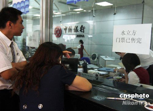 9月3日,觀眾在中國(guó)銀行北京王府井支行銷售網(wǎng)點(diǎn)排隊(duì)購(gòu)買殘奧會(huì)門票。據(jù)悉,從2日開始,又有一定數(shù)量的殘奧會(huì)比賽門票向公眾投放!八⒎健焙汀傍B巢”的殘奧會(huì)門票依然最火爆。但因?yàn)橥斗艛?shù)量不同,“水立方”門票只十分鐘就全部售光,中行王府井支行柜臺(tái)已經(jīng)張貼“水立方售完”告示。中新社發(fā) 吳芒子 攝