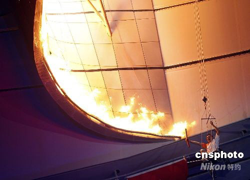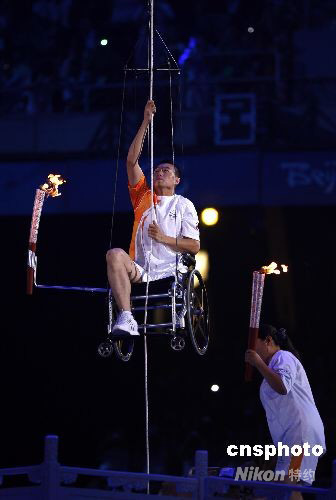 9月6日晚,北京2008殘奧會開幕式在國家體育場“鳥巢”舉行。 圖為殘奧會田徑金牌獲得者、最后一棒火炬手侯斌坐在輪椅上,拉繩子攀升至主火炬臺下,以獨特方式點燃“鳥巢”上方的主火炬。 中新社發(fā) 杜洋 攝