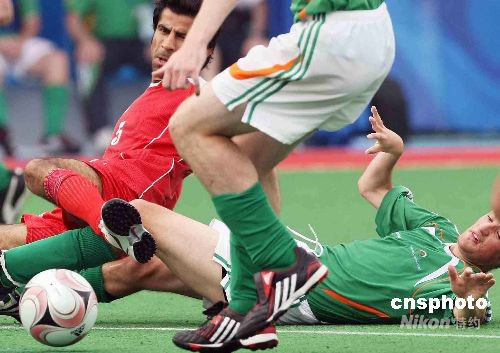 北京殘奧會(huì)七人制(男子)足球比賽9月8日在北京奧林匹克公園內(nèi)的橄欖球場(chǎng)開(kāi)賽,伊朗隊(duì)以4比2擊敗愛(ài)爾蘭隊(duì)。圖為伊朗隊(duì)5號(hào)哈迪·薩法理(紅)拼死防守愛(ài)爾蘭隊(duì)的最后進(jìn)攻。殘奧會(huì)七人制(男子)足球比賽在橄欖球賽場(chǎng)舉行,全場(chǎng)共60分鐘,隊(duì)員為腦癱患者。 中新社發(fā) 任晨鳴 攝
