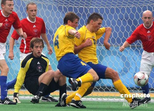 北京殘奧會(huì)七人制(男子)足球比賽9月8日在北京奧林匹克公園內(nèi)的橄欖球場(chǎng)開賽,實(shí)力超群的烏克蘭隊(duì)以8比1擊敗英國隊(duì)。圖為獨(dú)中三元的烏克蘭隊(duì)6號(hào)伊萬·什克瓦洛(黃)在英國隊(duì)禁區(qū)內(nèi)恣意沖殺,如入無人之境。殘奧會(huì)七人制(男子)足球比賽在橄欖球賽場(chǎng)舉行,全場(chǎng)共60分鐘。 中新社發(fā) 任晨鳴 攝