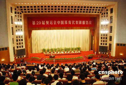 第29屆奧運(yùn)會(huì)中國(guó)體育代表團(tuán)報(bào)告會(huì)大會(huì)現(xiàn)場(chǎng)。