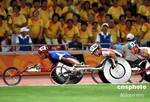 9月11日晚,北京殘奧會(huì)田徑比賽繼續(xù)在奧林匹克公園內(nèi)的國(guó)家體育場(chǎng)“鳥(niǎo)巢”舉行,在男子5000米-T54級(jí)決賽中,泰國(guó)選手巴越·沃霍倫一路領(lǐng)先,并在最后時(shí)刻頂住各路選手的反撲,在這個(gè)一直被歐美強(qiáng)手統(tǒng)治的項(xiàng)目中奪得冠軍。中新社發(fā) 任晨鳴 攝