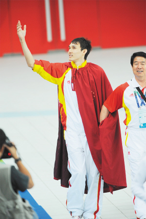 雖然最終收獲的還是“銀鑲玉”,但是楊博尊的心情已和8日晚有著天壤之別,臉上掛滿了笑容!斑@雖然不是我的主項,但是我發(fā)揮得很好,超越了自己,F(xiàn)在我終于知道,‘水立方’不僅有‘金鑲玉’,還有更多的是超越。無論是我,還是我的隊友,我們都很努力,都在不斷地超越自己。”興奮的楊博尊披上了早就準備好的“戰(zhàn)袍”,這本是他為自己奪冠時準備的。