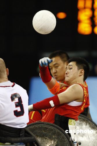 9月12日,北京殘奧會(huì)輪椅橄欖球展開(kāi)首日比賽,東道主中國(guó)隊(duì)以30比65的比分不敵美國(guó)隊(duì)。 中新社發(fā) 杜洋 攝