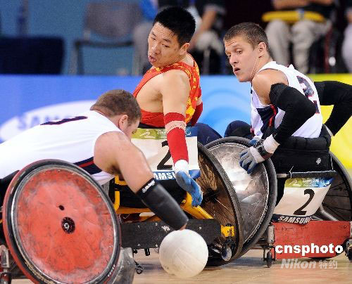 9月12日,殘奧會輪椅橄欖球比賽在北京科技大學體育館開賽,揭幕戰(zhàn)中國隊以30-65不敵世界排名第一的美國隊。剛剛組建一年的中國隊雖然戰(zhàn)敗,但始終面對微笑頑強拼搏永不言棄的球員們卻贏得了滿堂喝彩,贏得了包括美國隊在內的各方交口稱贊。中新社發(fā) CNAsports_p 攝