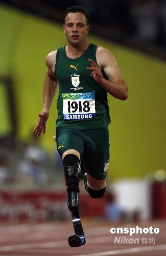 9月13日,北京殘奧會(huì)男子200米T44決賽中,來(lái)自南非的雙腿截肢運(yùn)動(dòng)員皮斯特瑞斯摘得金牌。中新社發(fā) 杜洋 攝