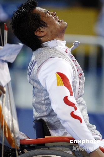 9月14日,北京殘奧會(huì)輪椅擊劍在北京國(guó)家會(huì)議中心擊劍館進(jìn)入首個(gè)比賽日,在男子個(gè)人花劍B級(jí)決賽中,10號(hào)種子中國(guó)選手胡道亮以15-8爆冷擊敗2號(hào)種子法國(guó)選手洛朗-弗朗索瓦,奪得金牌。