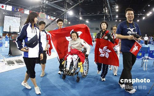 9月14日,北京殘奧會(huì)輪椅擊劍在北京國(guó)家會(huì)議中心擊劍館進(jìn)入首個(gè)比賽日,在女子個(gè)人花劍B級(jí)決賽中,頭號(hào)種子中國(guó)香港選手陳蕊莊以15-8戰(zhàn)勝9號(hào)種子中國(guó)選手姚芳,奪得金牌。 中新社發(fā) 盛佳鵬 攝