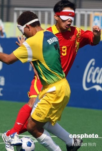 9月15日下午,北京殘奧會五人制(盲人)足球預賽最后一輪比賽在北京奧林匹克公園內的橄欖球場舉行,此前均保持全勝紀錄的中國隊與巴西隊相遇,巴西隊10號里卡多·阿爾維斯率先攻破中國隊大門;中國隊9號隊長王周彬下半時破門得分。最終雙方以1比1戰(zhàn)平,攜手晉級決賽。中新社發(fā) 任晨鳴 攝