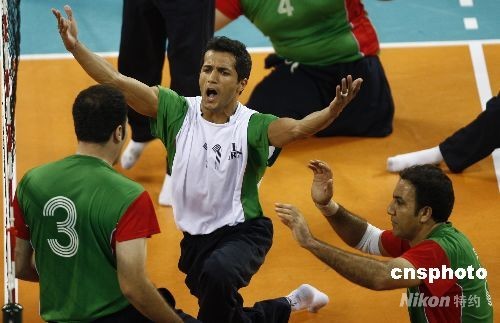9月15日,北京殘奧會男子坐式排球決賽,伊朗隊(duì)(綠)以3比0的比分戰(zhàn)勝波黑隊(duì),獲得冠軍。中新社發(fā) 杜洋 攝