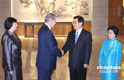 9月17日,中國國家主席胡錦濤與夫人劉永清在北京釣魚臺國賓館芳菲苑舉行宴會歡迎出席北京殘奧會閉幕式的國際貴賓。圖為胡錦濤與夫人迎接國際奧委會主席羅格夫婦。中新社發(fā) 廖文靜 攝
