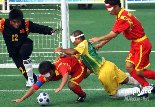 9月17日下午,北京殘奧會五人制足球決賽在北京奧林匹克公園內(nèi)舉行,雅典殘奧會冠軍巴西隊依靠強大的實力,最后以2比1擊敗中國隊蟬聯(lián)冠軍。中新社發(fā) 任晨鳴 攝