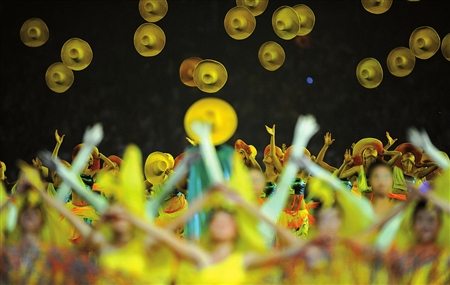 “歡慶篇章”是整臺(tái)晚會(huì)“寄給未來的一封信”的壓軸戲,而“草帽舞”是“歡慶”中的高潮部分、晚會(huì)的亮點(diǎn)之一。昨晚草帽舞華麗登場時(shí),成都的姑娘們從舞臺(tái)的左臺(tái)口向舞臺(tái)的右底角走“斜線一字”,動(dòng)作整齊,節(jié)奏分明,邊行進(jìn)邊傳遞草帽,她們的隊(duì)列沉穩(wěn)舒緩,時(shí)圓時(shí)方,變化萬千。到達(dá)鳥巢中間時(shí),草帽突然像金色的花朵,從演員手中快速飛出,在空中彼此飛舞,宛如向日葵花簇簇綻放,蔚為壯觀。而在草帽舞隊(duì)的四周,還有兩千多人輔以奔放灑脫的舞蹈表演。此時(shí)鳥巢內(nèi)已是掌聲雷動(dòng),歡呼陣陣。整個(gè)節(jié)目傳遞的是青春、是快樂,是少女的激情與奔放,是自由與陽光,是未來的希望,表演服飾也以紅黃為主調(diào),大紅艷麗,大黃成熟,直奔?xì)g慶主題。成都的姑娘們退場后激動(dòng)地說,她們的自信和當(dāng)晚的演出成功,離不開奧組委領(lǐng)導(dǎo)的關(guān)心支持。據(jù)悉,這批專業(yè)演員全部由成都市文化藝術(shù)學(xué)校的專業(yè)舞蹈學(xué)生、演員和舞蹈教師組成。(周帥)