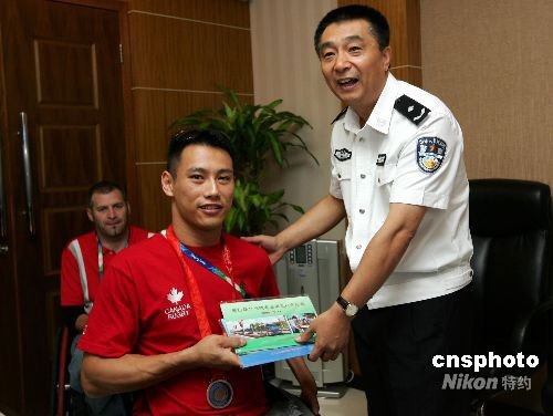 9月18日,一枚失而復(fù)得的北京殘奧會(huì)獎(jiǎng)牌由北京公交民警交還到了加拿大運(yùn)動(dòng)員杰瑞德手中。9月17日晚,加拿大運(yùn)動(dòng)員杰瑞德在乘坐出租車(chē)時(shí)不慎將自己的雙肩包遺忘在車(chē)上,公交民警接警后,在線索非常有限的條件下,只用了四個(gè)小時(shí),就將背包找回,里面有一枚寶貴的殘奧會(huì)橄欖球銅牌。中新社發(fā) 富田 攝