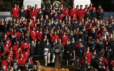 美國總統(tǒng)布什7日在白宮南草坪會見美國奧運(yùn)和殘奧代表團(tuán)。