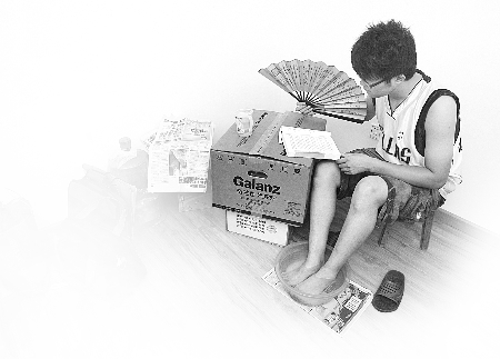 小韓說,自己與同學(xué)發(fā)明了一套“泡腳”消暑法,每當(dāng)晚上酷熱難當(dāng)時(shí),便每人接上滿滿一桶涼水,把雙腿完全泡在其中,泡腳的同時(shí)還可以看書、上網(wǎng),感覺非常涼爽。