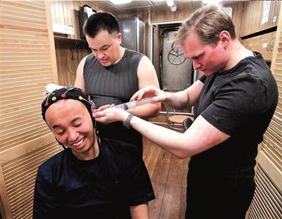 王躍(左一)在模擬艙內(nèi)進行腦電極試驗。俄羅斯生物醫(yī)學(xué)問題研究所供圖