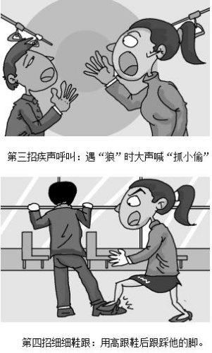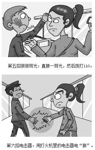 《公交防狼全手冊》發(fā)出后,引起了眾多女性關(guān)注,幾個小時之內(nèi)就有數(shù)以萬計的網(wǎng)民點擊,其中防狼六招也成為女性之間互轉(zhuǎn)的信息。這六招分別是:第一招冷冷目光,是用威懾力眼神與“狼”對視;第二招尋找依靠,即向司機或者售票員靠近;第三招疾聲呼叫,就是遇“狼”時大聲喊“抓小偷”;第四招細(xì)細(xì)鞋跟,就是用高跟鞋后跟踩他的腳;第五招狠狠耳光,就是直接打耳光,然后報警;對于第六招就更有意思了,就是用一次性打火機里的電擊器電“狼”,產(chǎn)生瞬間電壓足以讓“狼”手彈回去,而且不產(chǎn)生直接傷害。