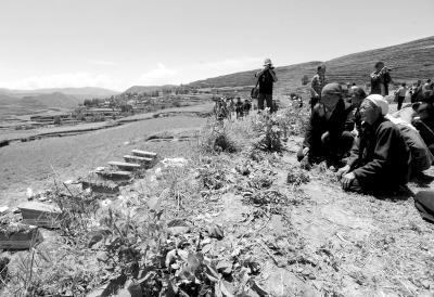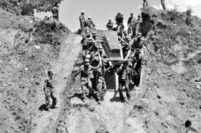 22日,解放軍官兵幫助永光村受災(zāi)群眾將棺材抬到下葬地點(diǎn)。