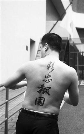 日前,劉強來到日本駐廣州總領(lǐng)館后脫下外套,亮出自己花4小時文出的“精忠報國”四字。