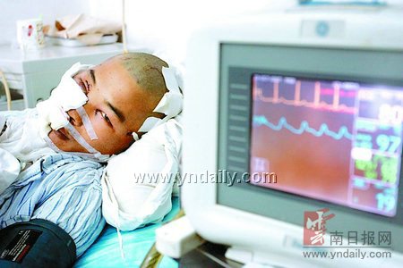 昨日,實施了面部縫合手術后,29歲的陳三拉靜靜地躺在昆醫(yī)附一院口腔頜面外科病床上,他的右臉全部被包了起來,由于傷勢嚴重,已經(jīng)很難開口說話。