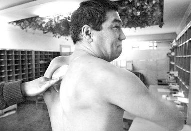 同事小童告訴記者,一次,郵政局運(yùn)羊毛,20公斤的大袋子要抬到約1.3米高的車廂上,其他人都是兩人抬一袋,可阿里甫一人提兩袋,只見他一手抓一袋,很輕松就把一袋羊毛扔到車上!拔覀儽緛砭团宸牧,現(xiàn)在他能用肩胛骨夾斷光碟,我們更佩服他了。”小童說。