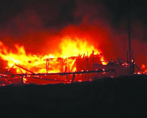 就在船主專心致志捕魚之際,突然他感到江面映出火苗的光亮;仡^一看,只見船艙里冒出一片火來,“不得了,怎么失火了?”船主大吃一驚,連忙丟下漁網,拎起一桶水就潑過去,但杯水車薪,根本不管用,火勢越來越大,他將帶繩的桶扔到江里,想從江里打水上來撲火,但還沒等打上來第一桶水,剎那間,整個船艙就成了一片火海。由于火勢兇猛,他的頭發(fā)眉毛都被燒焦了?粗矍八袞|西都著火了,他意識到還是逃命要緊,被迫棄船,轉身向船頭跑去,對著江里的棧船就跳了過去。船主剛跳上棧船,就聽后面“轟”的一聲巨響,放在船艙里的那桶柴油也被燒著了。