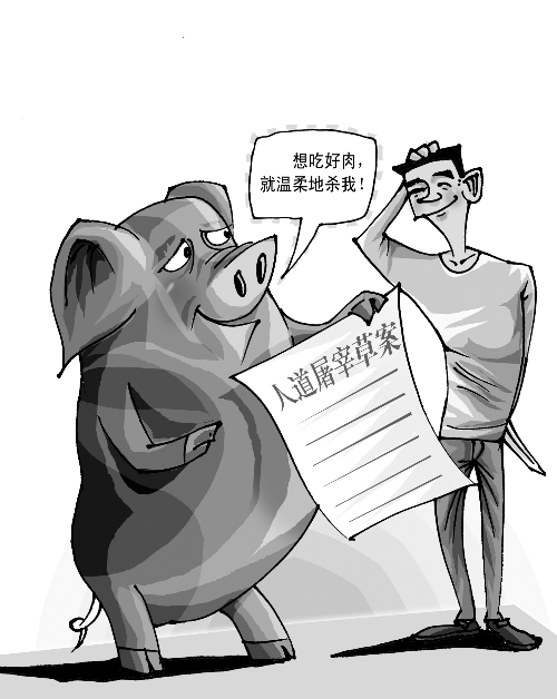 趕豬的時(shí)候,要拿著塑料拍輕輕地拍豬屁股,哄著它往前走;在上“斷頭臺(tái)”的途中,還要看到自己的伙伴,這樣才能讓待宰的豬沒(méi)有恐懼感……這些僅僅是正在制定的人道屠宰規(guī)定的一小部分。