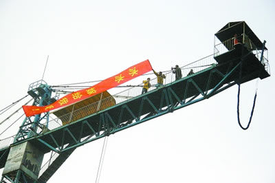小樊這時站在了鐵架頂端,工作人員將其腰間用保險鎖固定好,一切準(zhǔn)備就緒,一大紅條幅打了出來,上寫:冰冰,嫁給我吧!