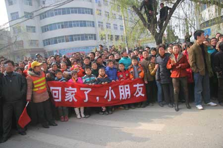 11時(shí),一個(gè)由近20輛車組成的車隊(duì)從賓館出發(fā)到高速路口迎接孩子?吹杰囮(duì)出來(lái),人群讓出通道。擠在人群最前面的是淅川縣的部分小學(xué)生。他們舉著小旗、拍起巴掌,拉起條幅“小朋友,歡迎你們回家”。
