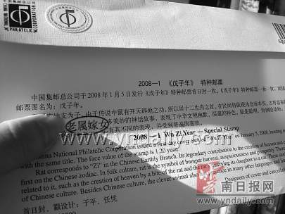 記者隨后來(lái)到楚雄集郵經(jīng)營(yíng)部,花了2.2元也購(gòu)買(mǎi)了一枚《戊子年》特種郵票首日封。該套首日封編號(hào)為2008-1,印量30萬(wàn)枚,封上還加貼了中國(guó)集郵總公司的防偽標(biāo)簽。當(dāng)記者向工作人員詢(xún)問(wèn)首日封文字中出現(xiàn)的錯(cuò)誤時(shí),這位工作人員顯然完全不知情,經(jīng)提醒看到后,她連連表示,這樣的情況以前從未發(fā)生過(guò),這還是頭一次碰到。她隨即拿出和首日封一起配套發(fā)行的一套鼠年郵票仔細(xì)查看,記者注意到,上面有首日封設(shè)計(jì)者于平和任憑的介紹,并且在多處出現(xiàn)了“老鼠嫁女”的字樣,但并無(wú)任何差錯(cuò)。據(jù)工作人員介紹,首日封在楚雄的發(fā)行量?jī)H70枚,目前已銷(xiāo)售了近40枚。(王維娜 攝影報(bào)道)