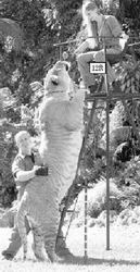 該動物園內(nèi)的一只成年獅虎獸“赫拉克勒斯”目前已經(jīng)長到3.7米長,體重超過了500公斤!當(dāng)動物園的馴獸師奇娜·約克給“赫拉克勒斯”喂食時(shí),盡管她站在了一個(gè)4米多高的支架上,但“赫拉克勒斯”仍輕易地站起了整個(gè)身子,并抓取到了奇娜手中的食物。雖然美國邁阿密稀有瀕危物種協(xié)會的環(huán)保專家布哈加文·安特爾博士仍勇敢地站在它身邊,但安特爾的身高只有“赫拉克勒斯”的一半。