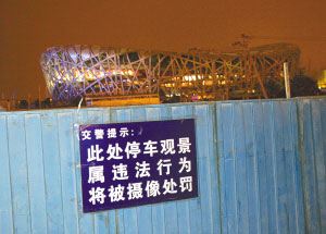 “此處停車觀景屬違法行為,將被攝像處罰”。隨著奧運(yùn)會(huì)的日漸臨近,“鳥巢”、“水立方”逐漸成為了奧運(yùn)熱門景點(diǎn),北辰橋上每天有眾多游客停車拍照。為此,交管部門在橋上設(shè)立交通警示牌,告誡司機(jī)停車拍照將受處罰。