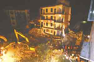 文化鎮(zhèn)中心;锸硤F(tuán)職工曾家福介紹,綜合樓是1995年下半年建的,1996年秋投入使用。水泥欄桿掉光的教學(xué)樓是1994年所建。記者看到,綜合樓屬預(yù)制板式樓房,垮塌的廢墟中橫七豎八地倒著預(yù)制板,僅橫梁可見少量鋼筋。 記者冉啟虎